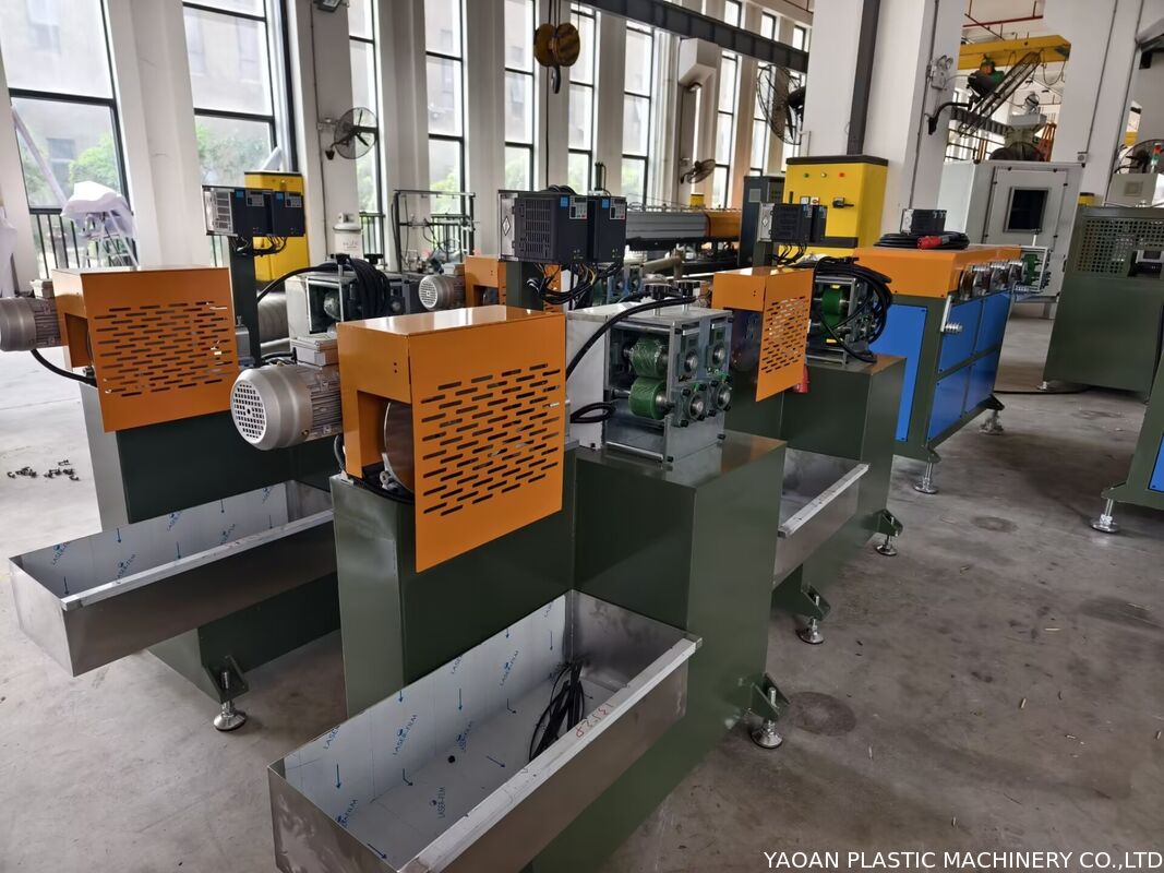 The YAOAN Φ55/30 three-color synthetic rattan extrusion line is a newly upgraded high-speed, high-stability plastic extrusion equipment specially used for producing PE / PP / PVC three-color imitation rattan. It adopts a single-screw main extruder with Φ55 screw and two sets of Φ30 color extruders, which can stably produce colorful, gradient, mixed-color, and patterned plastic rattan with uniform color, clear texture, and good toughness.
